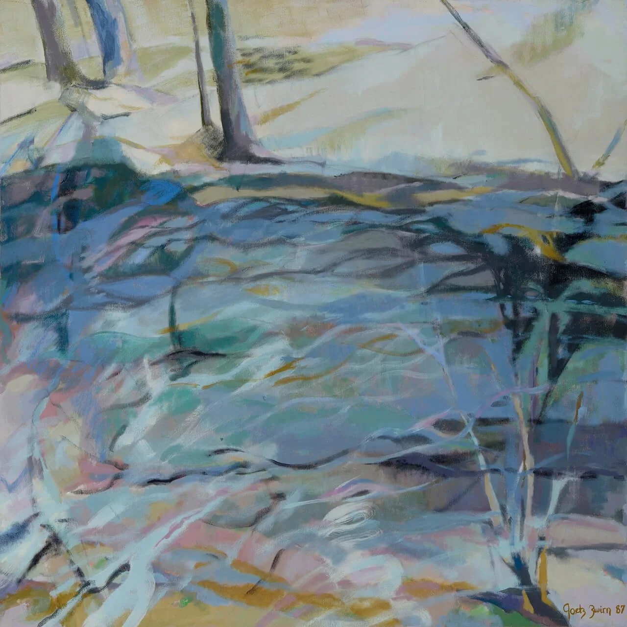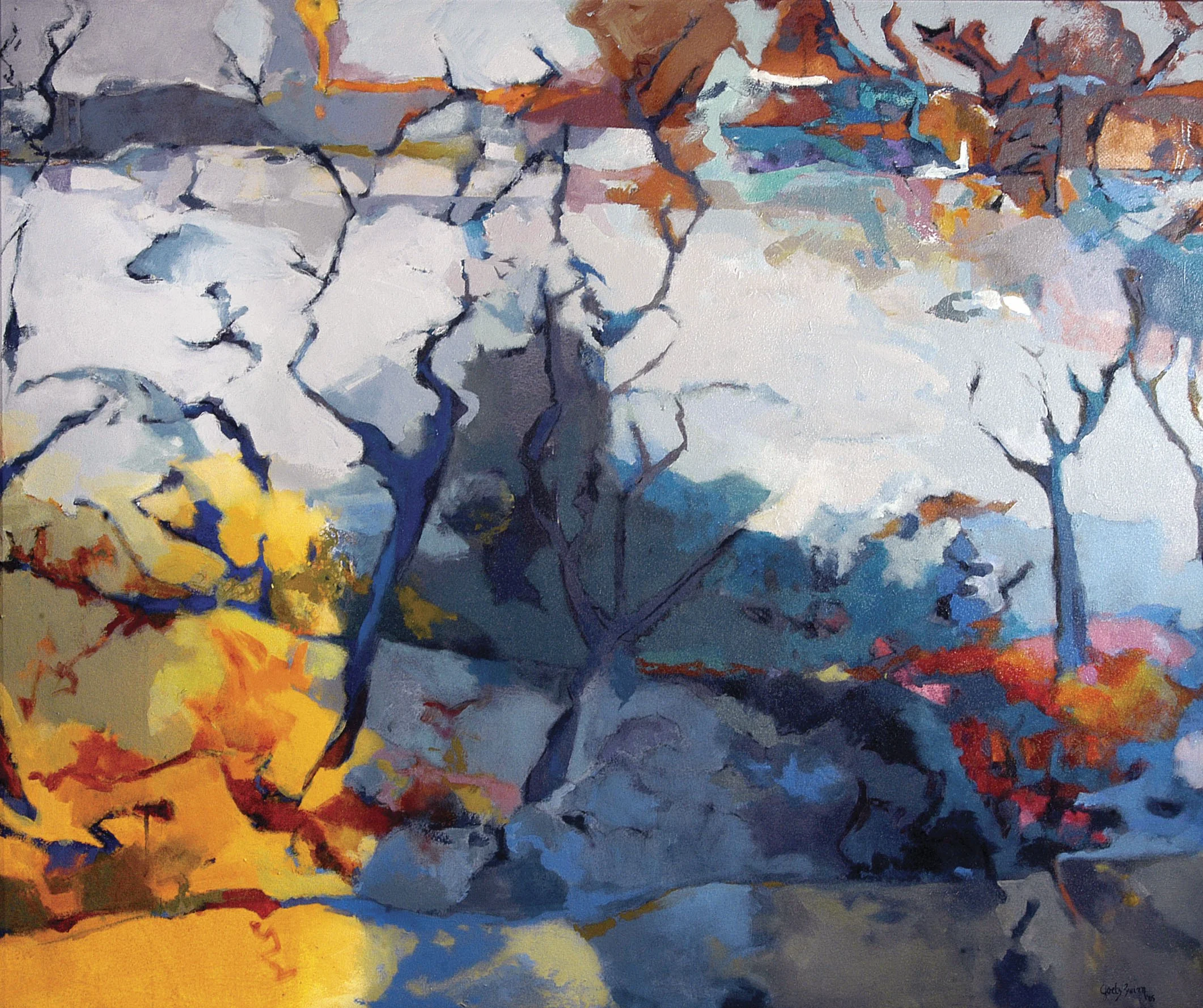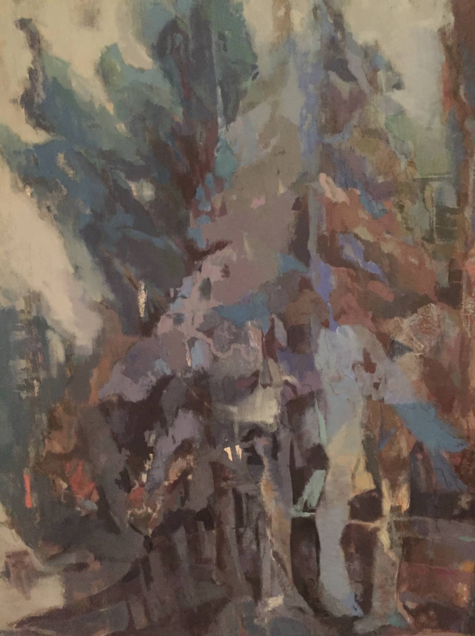 "The exhibit includes the powerful mood piece Zwirn's 'Thoughts of Aaron’ aka 'Winter', Blue and lavender shapes form a forest that is washed by lighter patterns which create tree trunks resembling legs."